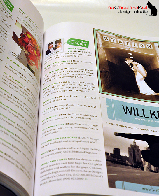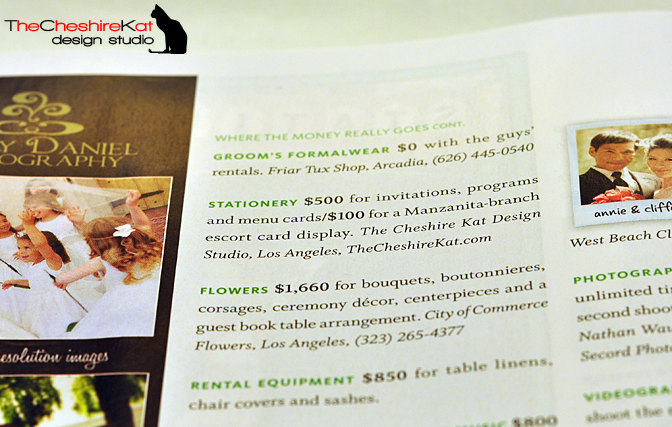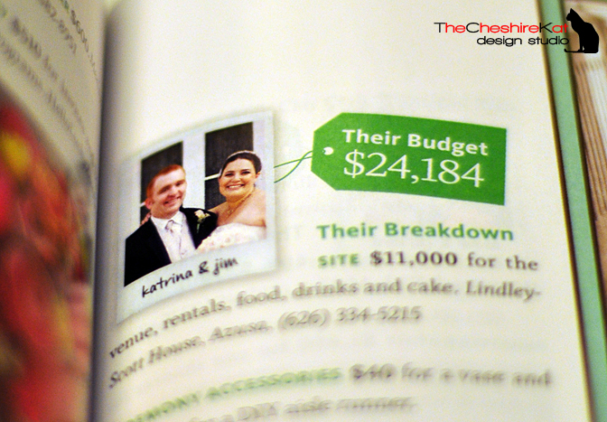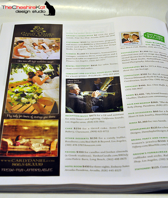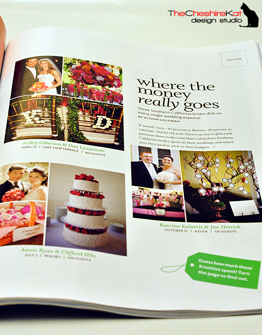 Happy New Year, everyone! I’m super excited to finally be able to add this to the blog. My wedding appeared in an article in The Knot Southern California magazine (Spring/Summer, 2010)! A few months ago, I was asked by the editors of The Knot SoCal to share my budget breakdown and vendor contact information for my October 2008 wedding. Since I had the information readily accessible in a spreadsheet, I was happy to send it over. Then, right before Christmas, I found the magazine on the shelf, and there we are – with pictures and everything! Check out some shots of the magazine below (and thanks to my husband for taking them!), let me know if you have any questions about the wonderful vendors who were a part of our big day, and stay tuned for some big announcements in the next few days. There are some huge changes on the horizon for TCK Design, and I can’t wait to share them with you!